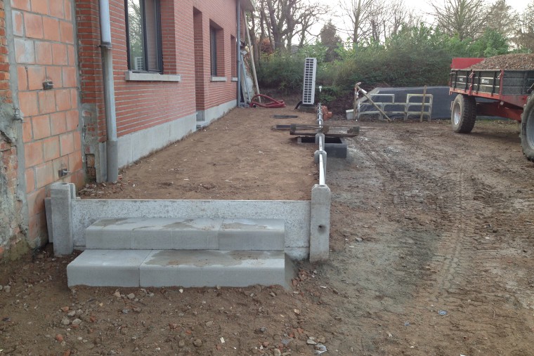 Vooraan hebben wij massieven trappen geplaatsen in beton voor de toegang naar de inkom.